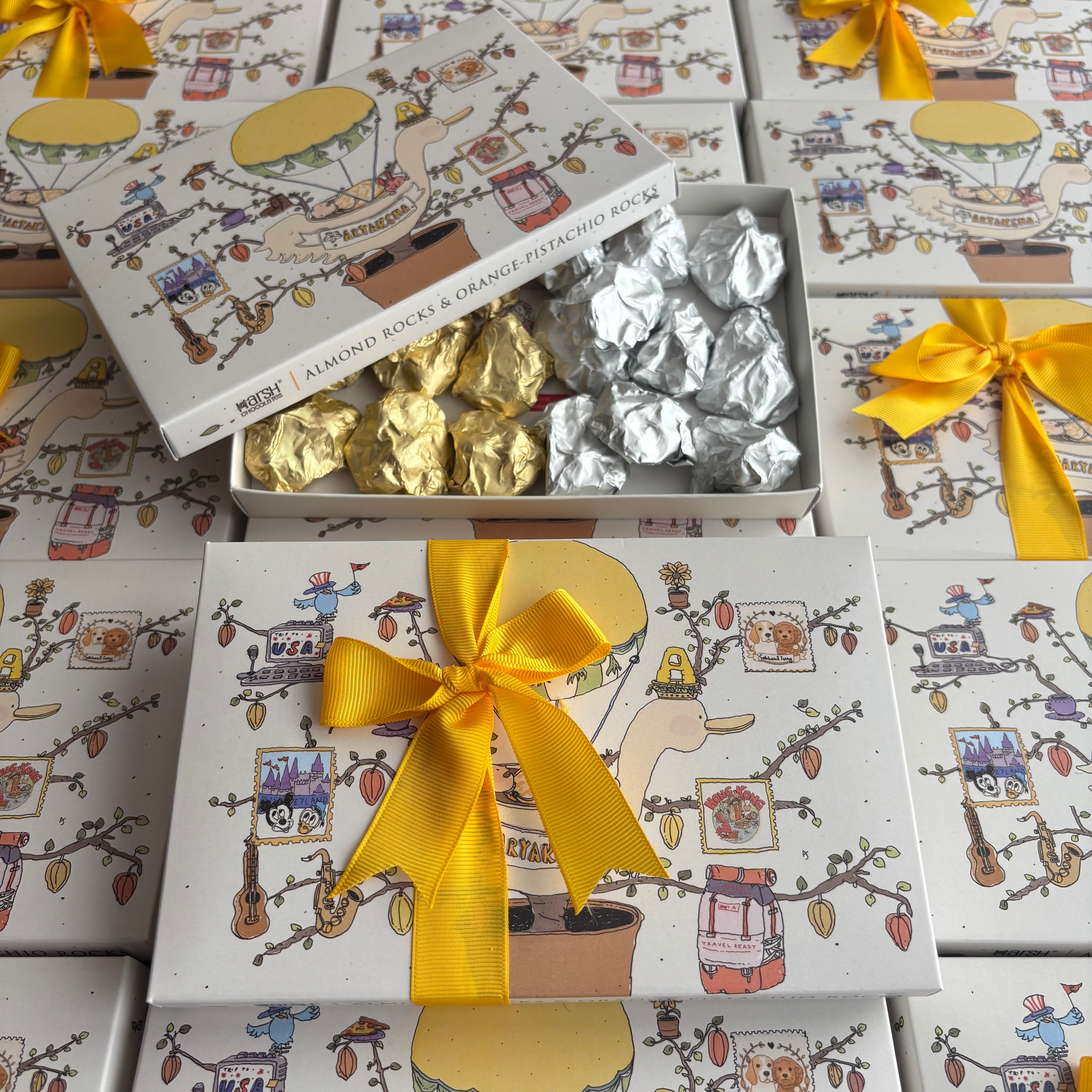 Order yourself the assortment of our signature collection - almond rocks, biscuit chocolates and the newest recipe - orange pistachio rocks!